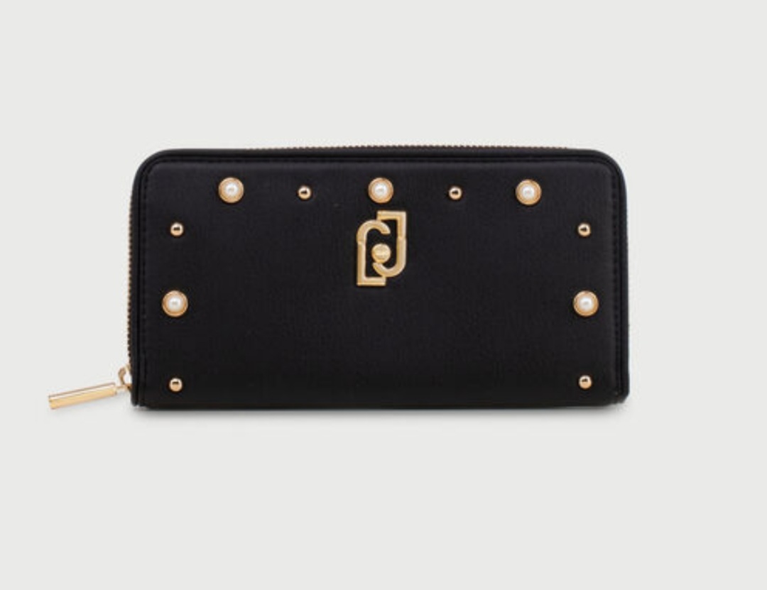 portafoglio con perle e dettagli dorati e chiusura con cerniera