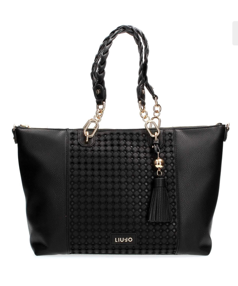 shopping bag realizzato in similpelle dotato di due manici intrecciati e tracolla con ricamo nella parte cfrontale misure 36x28x15 cm